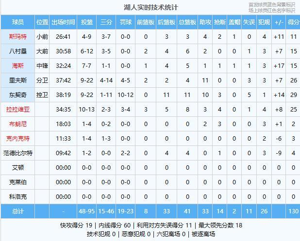 湖人数据(主队):东契奇29分11板10助3断、里夫斯26分4板11助、拉拉维亚25分8板3助4断、八村塁15分6板2助、海斯15分5板1助、斯玛特11分3板4助2断、范德比尔特4分4板、克内克特3分、布朗尼2分2助3断